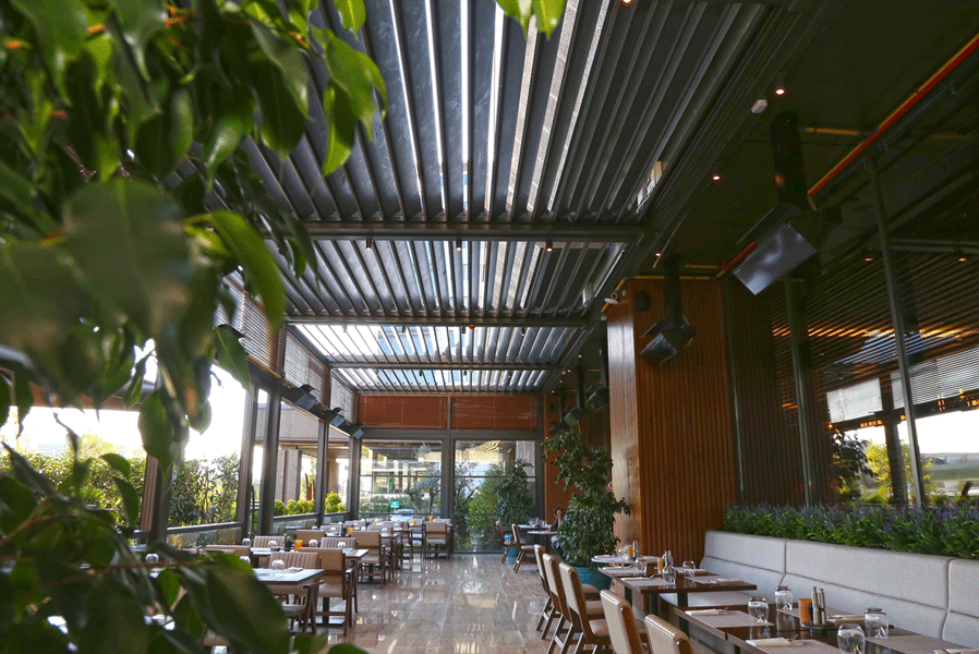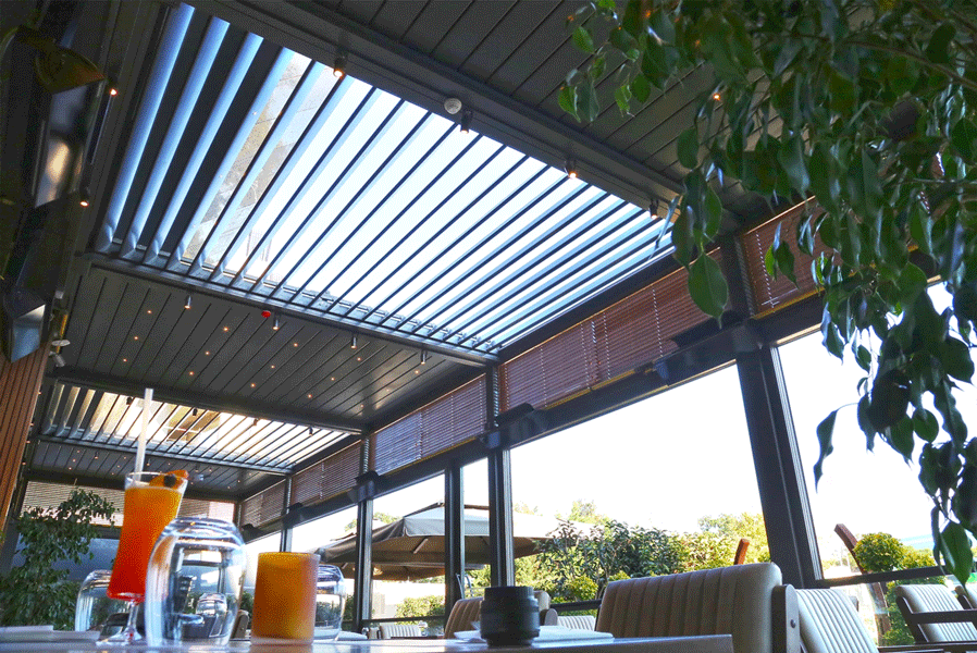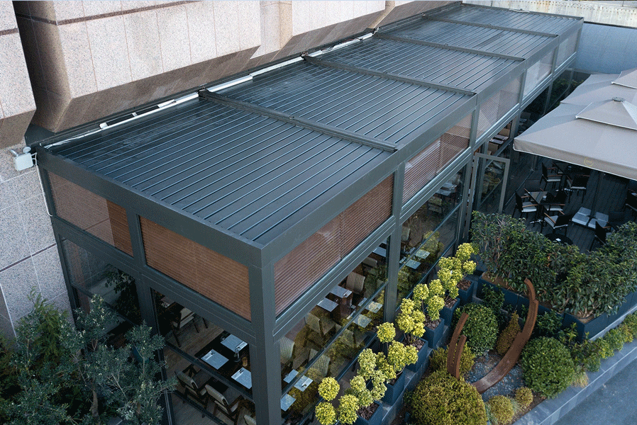 Rolling Roof, cafe, restoran, otel terasları ve villa bahçeleri için ideal bir çözümdür. Geniş açıklıkları tek parça halinde kapatabilme özelliği ile mimari sınırları zorlar. Özel tasarım imkanı ile her mekana uygun boyut ve renk seçenekleri sunuyoruz.